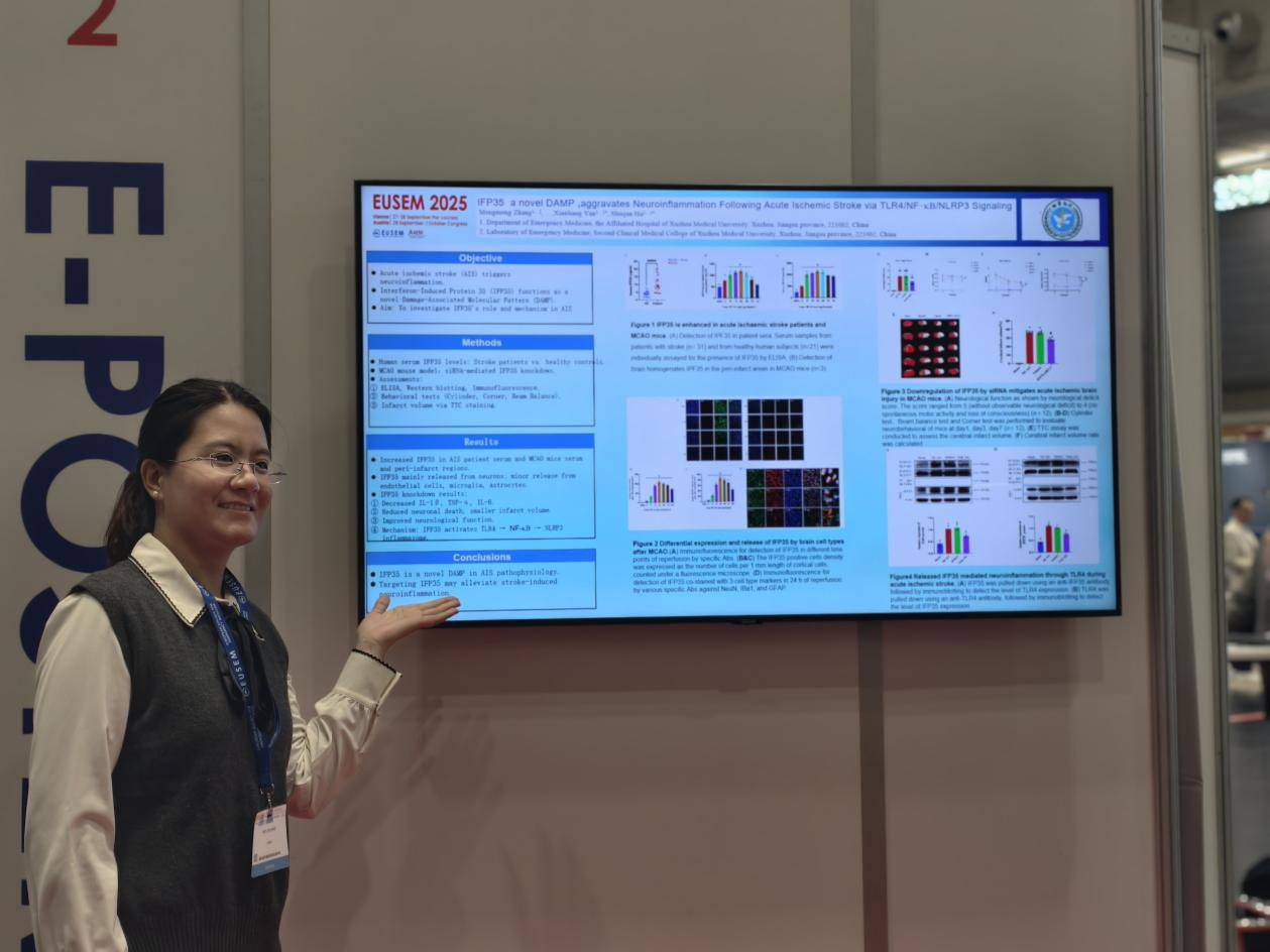 庄伟副教授的壁报《IFP35作为一种新型DAMP,通过TLR4/NF-κB/NLRP3信号通路加剧急性缺血性脑卒中后的神经炎症》,深入揭示了脑卒中后神经炎症损伤的新机制。该基础研究的突破,为未来开发针对性的神经保护靶向药物提供了重要的理论依据和创新思路,获得了同行的高度评价。