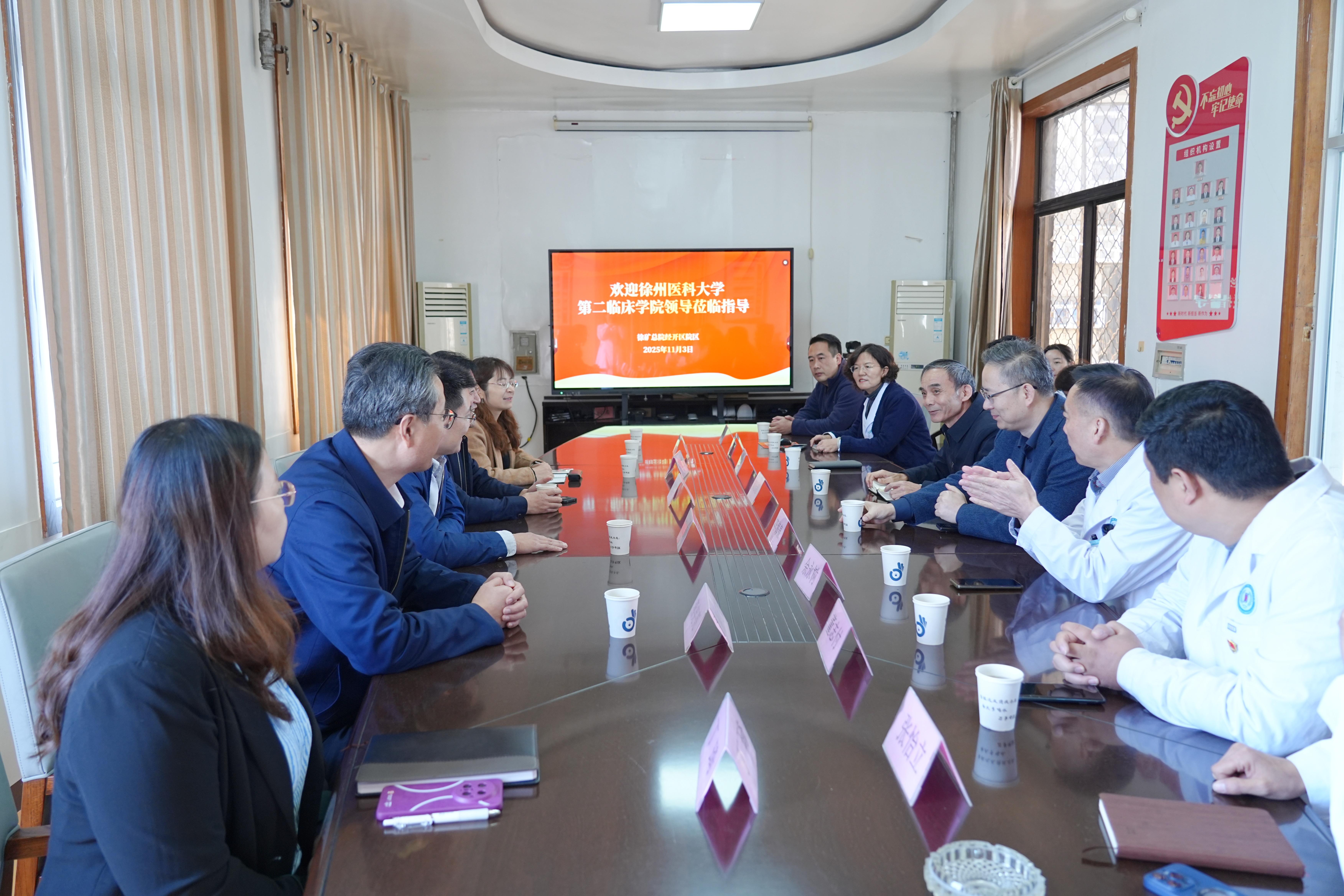 11月3日上午,为进一步深化校院合作,开展访企拓岗工作,推动精神医学专业建设与人才培养,第二临床医学院院长孙甫存、党委书记刘立忠带队前往徐矿集团总医院经开区院区进行调研交流。徐矿总医院副院长李海泉、院区院长郭玉超、党委书记吕福庆等领导班子成员及相关科室负责人陪同参会。会议由徐矿总院副院长李海泉主持。