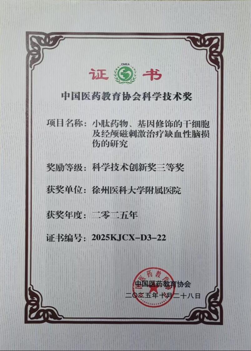 我院急救与救援医学团队燕宪亮、胡书群、许铁等9位老师的成果《小肽药物、基因修饰的干细胞及经颅磁刺激治疗缺血性脑损伤的研究》荣获中国医药教育协会科学技术创新奖三等奖。该成果通过整合分子生物学、药理学、基因工程、干细胞治疗、康复理疗学等多学科技术,聚焦于小肽药物抑制Procaspase3/7/9与XIAP间的转亚硝基化、Wnt3a/VEGF外源基因的工程化干细胞移植、重复经颅磁刺激等的治疗可发挥较好的脑缺血后神经保护作用,构建了“文献挖掘-理论阐释-模型优化-机制解析-物质基础-新药新技术开发”的完整研究体系,产出了系列高水平成果,丰富了脑缺血治疗的理论体系及防治措施。