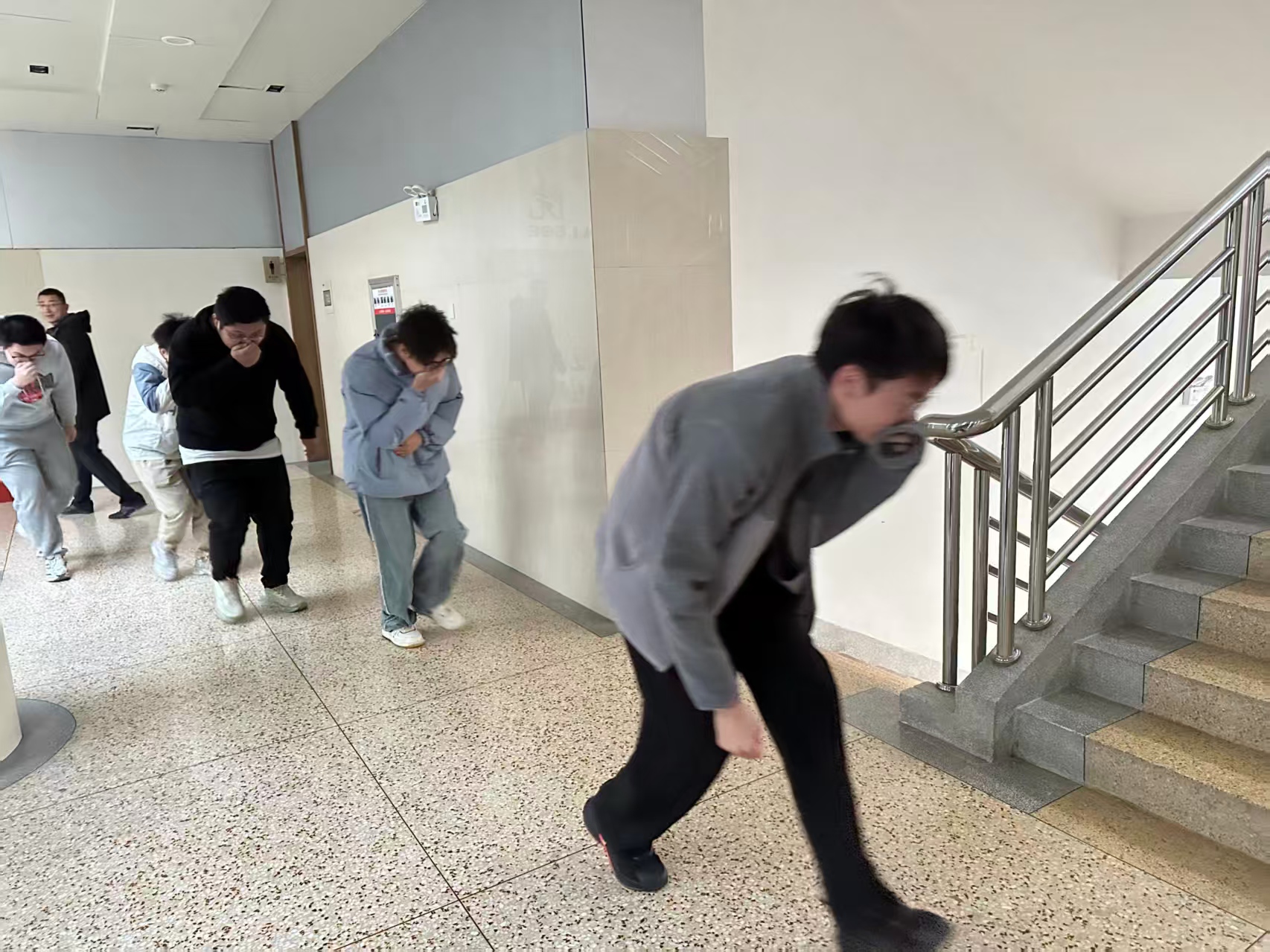 随后,学院组织师生进行消防应急疏散演练,本次演练不仅模拟真实火灾场景,引导学生在警报、浓烟的条件下,迅速按照应急疏散路线有序撤离至安全区域,还设置现场教学环节,由钟卫权副院长讲解灭火器的正确使用方法。通过“理论+实践”的沉浸式体验,学生直观地学习到火场逃离技能和初期火灾扑救要领,切实提升面对突发火情时自救能力和心理素质。