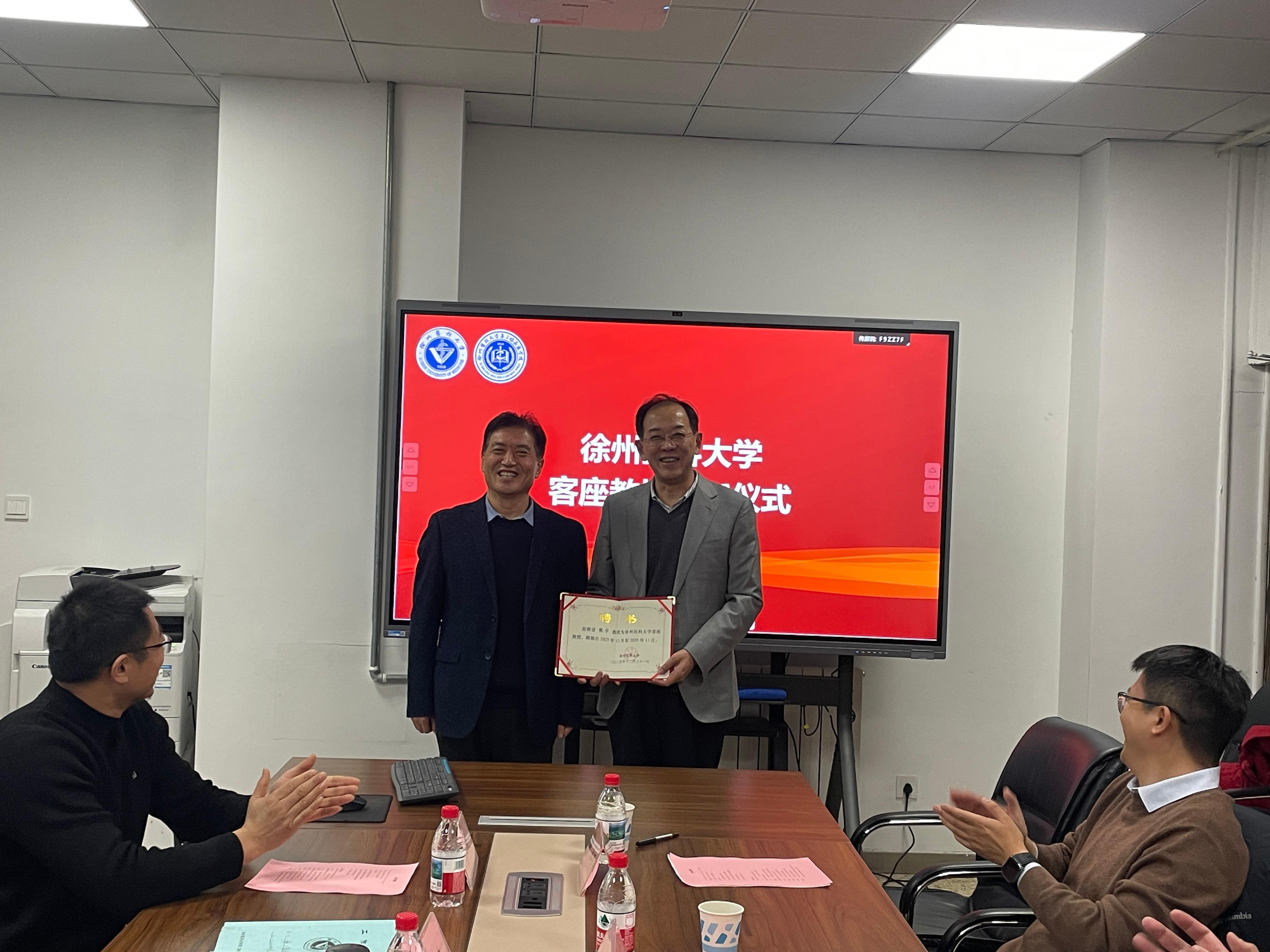为进一步推动我院精神医学专业与学科建设和人才培养,扩大学校及学院在精神医学领域影响,12月31日下午,我院邀请了南京医科大学附属脑科医院教授张宁、盐城市第四人民医院院长刘宏、副院长周爱华莅临我院,开展客座教授聘任仪式暨精神病与精神卫生学学科建设研讨会。学院院长孙甫存、党委副书记李红梅、副院长钟卫权、徐州医科大学附属徐州东方医院院长(精神医学系主任)张才溢参会。会议由钟卫权主持。