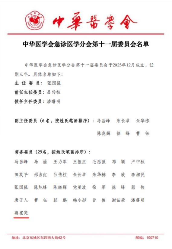 燕宪亮教授的成功当选,离不开学校、学院党委的正确领导与大力支持,是学院深入推进“学科筑峰、人才强院”战略的成果。长期以来,学院以学科建设与人才培养为核心,强化急诊医学师资与教学团队建设,打造“教学精、临床硬、科研强”的专业队伍,为学科带头人成长提供良好环境。此次当选,充分体现了学院在急诊医学领域的教学优势与人才培养实力。