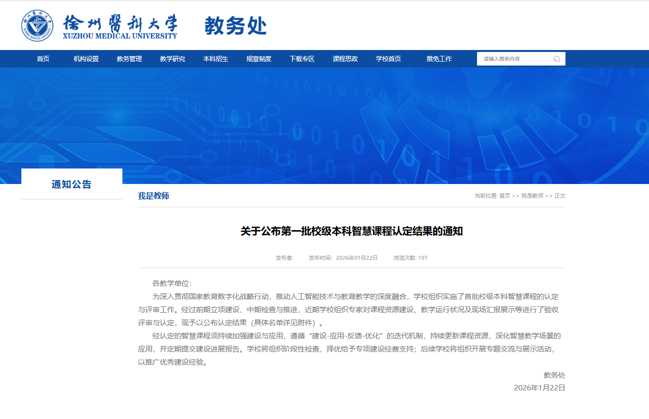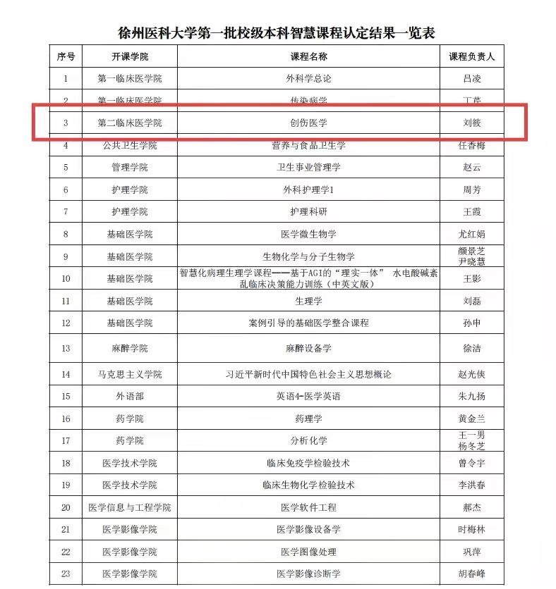 近日,学校教务处正式公布第一批校级本科智慧课程认定结果。由第二临床医学院创伤医学教研室牵头建设的《创伤医学》课程,凭借扎实的资源建设、创新的教学模式与良好的教学成效,顺利通过专家评审与现场验收,成功入选校级本科智慧课程名单。