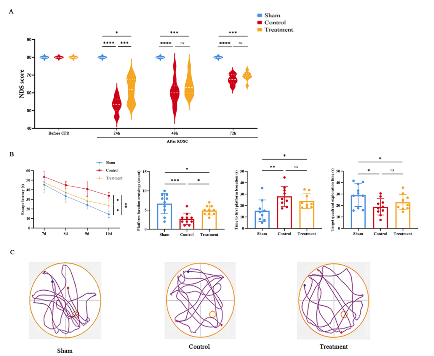 为了进一步验证靶向IL-17A的治疗潜力,研究团队建立了大鼠心脏骤停模型,并给予临床获批的抗IL-17A单克隆抗体(司库奇尤单抗/secukinumab)进行干预。结果令人振奋:接受抗IL-17A单抗治疗的大鼠,其11天生存率明显提升。同时,治疗组大鼠的神经功能缺损评分及水迷宫空间认知表现均得到显著改善。机制分析表明,该抗体有效降低了脑组织中神经炎症反应及脑损伤。
