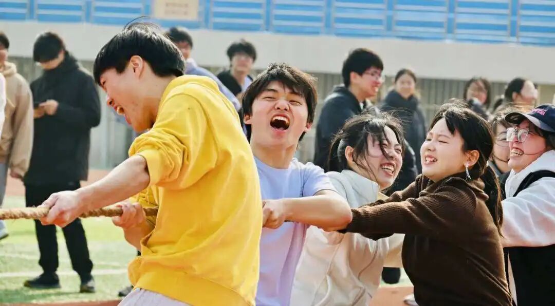 哨声一响,双方队员紧握长绳,身体后倾,双脚蹬地,齐心协力向后发力。绳子绷得笔直,中间标记左右僵持。呐喊声、加油声震耳欲聋,每个人咬紧牙关,拼尽全力,用团结与力量对抗,只为赢得最终胜利。